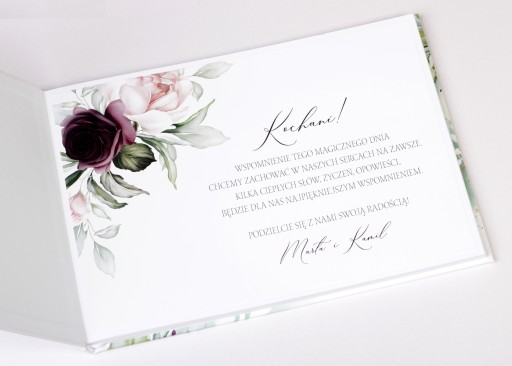 UWAGA! Cena obejmuje jedną księgę gości, projekt okładki oraz na życzenie: pierwszej strony widocznej po otwarciu którą wklejamy do księgi.