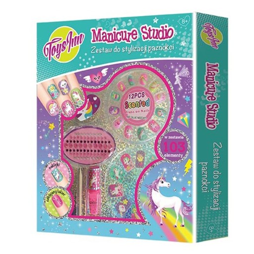 Zestaw do stylizacji paznokci JEDNOROŻEC, pozwala udekorować paznokcie w motywy z jednorożcem. Do dyspozycji jest odklejany lakier, oraz tipsy i naklejki na paznokcie mocowane bez użycia dodatkowego kleju. Dodatkowym akcentem są przyklejane kryształki: srebrne, różowe i fioletowe.