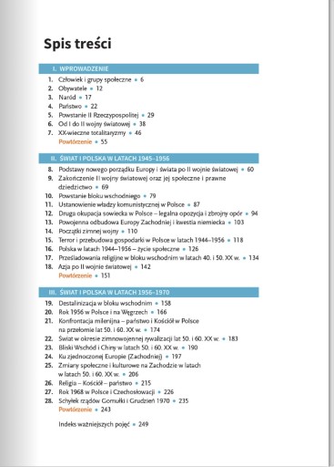 Materiał edukacyjny obejmuje 4 działy, w tym I dział stanowi wprowadzenie, które przedstawia i porządkuje wybrane zagadnienia oraz pojęcia (w tym z historii i WOS w klasach 4-8 szkoły podstawowej), kluczowe dla problemów omawianych na lekcjach historii i teraźniejszości w liceum i technikum. Pozostałe treści, rozdzielone na 2 działy, dotyczą dziejów świata i Polski w latach 1945–1970.
