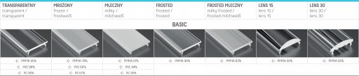 - Mleczny - biała przesłonka - wnętrze profilu jest niewidoczne, bardzo dobrze rozprasza punkty świetlne