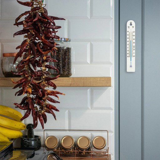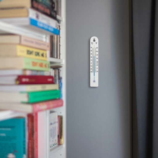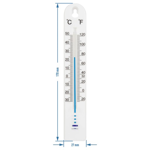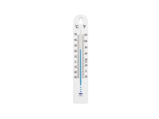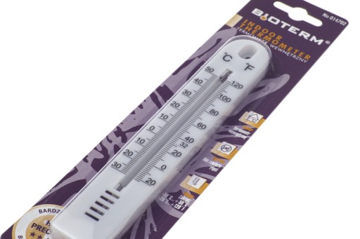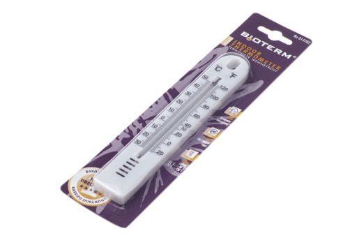 Termometr wykonany z białego tworzywa. Z jednej strony zakończony wyraźnym łukiem. Kapilara osadzona w głęboko w zagłębieniu obudowy.