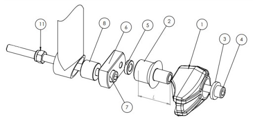 - Dokręć ślizgacze (1) oraz korpusy cylindryczne (2) do adapterów, używając śrub klasy 8,8 (4), podkładek stalowych (3) i tulei dystansowych (5).