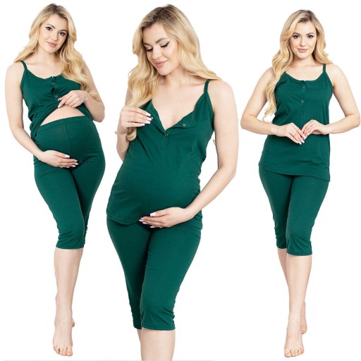 Zielona piżama ciążowa składa się z koszulki na ramiączkach oraz rybaczek. Koszulka jest niezwykle wygodna ze względu na umieszczenie zapięcia na środku, co pozwala szybko i bez wysiłku nakarmić maleństwo. Spodenki posiadają elastyczną gumkę, która nie uciska brzuszka. Piżama idealnie sprawdzi się w ciepłe, letnie dni oraz jako element garderoby podczas pobytu w szpitalu. Piżama do karmienia w kolorze butelkowej zieleni jest niezwykle elegancka i przewiewna, a jej dodatkowy plus stanowi wytrzymałość, którą zawdzięcza naturalnej bawełnie oraz polskiej produkcji. Kupując ją, każda mama może mieć pewność, że doskonale sprawdzi się zarówno trakcie długich miesięcy ciąży, jak i w czasie karmienia maluszka.