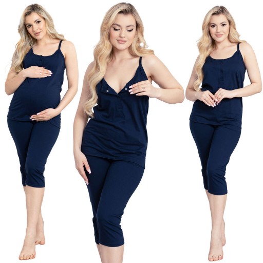 Granatowa piżama ciążowa składa się z koszulki na ramiączkach oraz rybaczek. Koszulka jest niezwykle wygodna ze względu na umieszczenie zapięcia na środku, co pozwala szybko i bez wysiłku nakarmić maleństwo. Spodenki posiadają elastyczną gumkę, która nie uciska brzuszka. Piżama idealnie sprawdzi się w ciepłe, letnie dni oraz jako element garderoby podczas pobytu w szpitalu. Piżama do karmienia w kolorze granatowym jest niezwykle elegancka i przewiewna, a jej dodatkowy plus stanowi wytrzymałość, którą zawdzięcza naturalnej bawełnie oraz polskiej produkcji. Kupując ją, każda mama może mieć pewność, że doskonale sprawdzi się zarówno trakcie długich miesięcy ciąży, jak i w czasie karmienia maluszka.