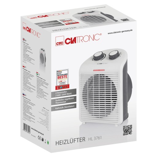 Clatronic HL 3761 to kompaktowy termowentylator, z którym chłodne dni nie będą już nieprzyjemne. Niewielkie urządzenie o mocy max 2000 W szybko i skutecznie ogrzeje łazienkę, pokój dzieci lub biuro. Ze względu na niewielkie wymiary i wygodny uchwyt możesz go także zabrać ze sobą do przyczepy kempingowej, na działkę i do garażu.
