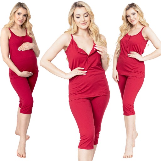 Bordowa piżama ciążowa składa się z koszulki na ramiączkach oraz rybaczek. Koszulka jest niezwykle wygodna ze względu na umieszczenie zapięcia na środku, co pozwala szybko i bez wysiłku nakarmić maleństwo. Spodenki posiadają elastyczną gumkę, która nie uciska brzuszka. Piżama idealnie sprawdzi się w ciepłe, letnie dni oraz jako element garderoby podczas pobytu w szpitalu. Piżama do karmienia w kolorze bordowa jest niezwykle elegancka i przewiewna, a jej dodatkowy plus stanowi wytrzymałość, którą zawdzięcza naturalnej bawełnie oraz polskiej produkcji. Kupując ją, każda mama może mieć pewność, że doskonale sprawdzi się zarówno trakcie długich miesięcy ciąży, jak i w czasie karmienia maluszka.