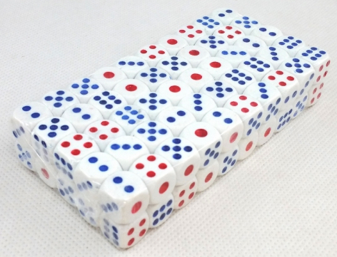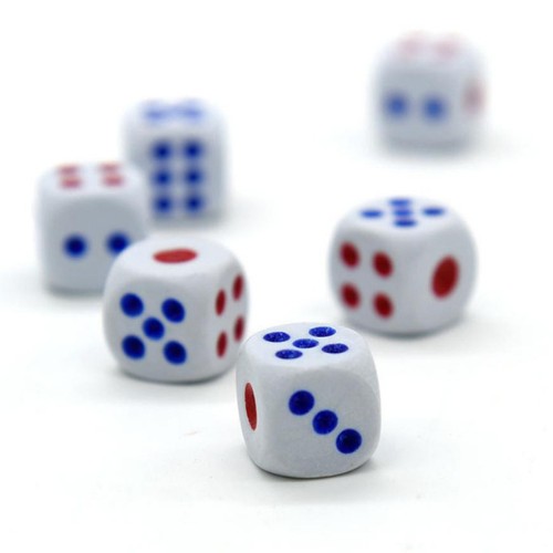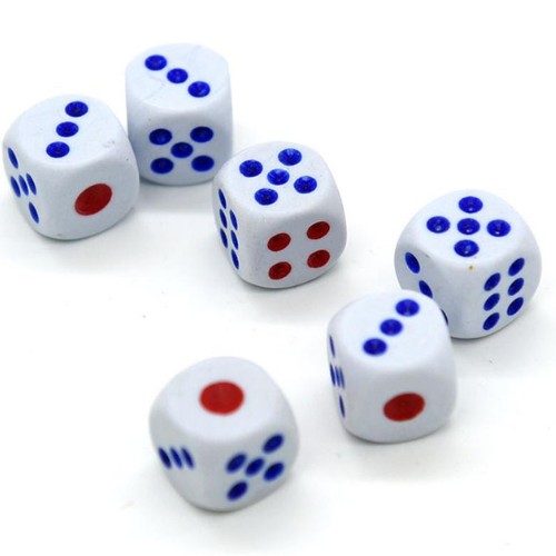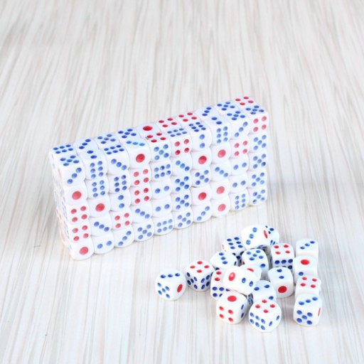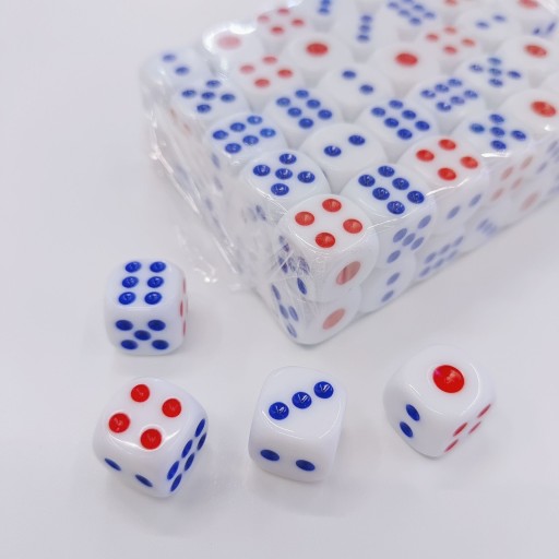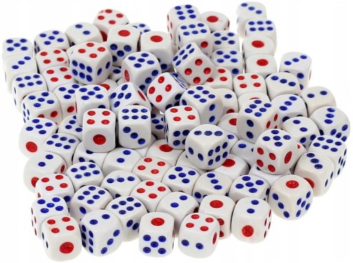 - Kolor kości – biały z niebiesko-czerwonymi kropkami cyframi.