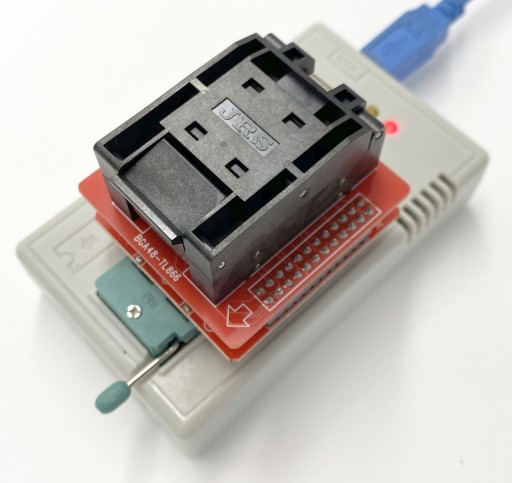Adapter (AddOn) BGA48-TL866 - oryginalny adapter przeznaczony do programowania układów pamięci typu 28/29/39/49F(LV)200/400/800/160 w obudowie BGA48 (o wymiarach: 6x8mm z rastrem (pitch) 0,8mm) programatorami rodziny MiniPRO (TL866CS/TL866A) oraz XGecu TL866II Plus. poprzez adapter pośredni SN001-1 (wchodzący m.i. w skład zestawu adapterów SMD)