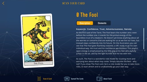 Tarot iCard to 78 kart tarota autorstwa A.E. Waite, które oferują zupełnie nowe możliwości: wylosuj kartę i zeskanuj telefonem komórkowym lub tabletem jej kod znajdujący się w prawym górnym rogu. W aplikacji możesz przeczytać interpretację, zintegrować ją z różnymi wzorcami czytania i zapisać każdy odczyt z notatkami, datą i pytaniami. W ten sposób możesz stworzyć swój własny dziennik tarota. Ponadto nowatorskie efekty szkła powiększającego szczegółowo pokazują symbole Wielkich Arkanów i wyjaśniają ich znaczenie.