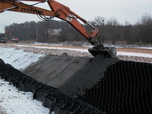 Kruszywo zamknięte w poszczególnych komórkach geosiatki komórkowej i zagęszczone do odpowiednich wskaźników zagęszczenia przyczynia się nawet do kilkunastokrotnego wzrostu nośności podłoża.