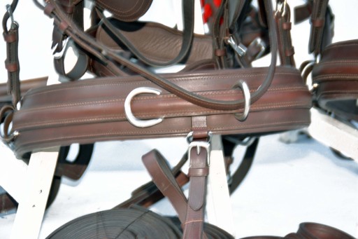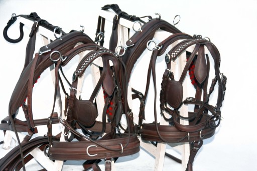 Uprząż na parę koni roz.FULL . Uprząż wykona w całości bardzo dobrej selekcjonowanej skóry licowej ,bardzo miękkiej i miłej w dotyku ,we wszystkich elementach uprzęży wszyta taśma ,która ma zadanie wzmocnienie skóry.Profilowane piersi wyposażone w napierśniki ,popręgi anatomicznie profilowane ogłowia anatomiczne w części potylicznej i nachrapnik zrobiony na miękko Okucia wykonane ze stali nie rdzewnej .jedyna taka uprząż na rynku ,perfekcyjnie wykonanie.Polecam