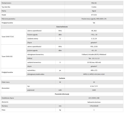 - pomiar sygnałów DVB-T/T2/C oraz DVB-S/S2 (w pełni kompatybilny z MPEG-2/MPEG-4)