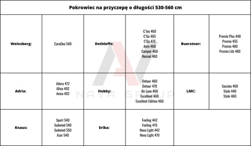 Pokrowiec bardzo dobrze pasuje na przyczepy kempingowe o długości całkowitej 530-560cm.