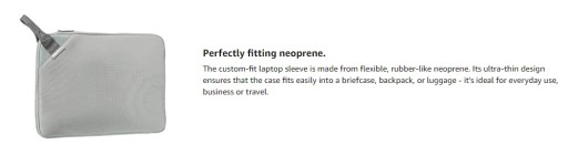 Pokrowiec na laptopa wykonana jest z elastycznego, gumopodobnego neoprenu. Jego ultracienka konstrukcja sprawia, że etui z łatwością mieści się w teczce, plecaku lub bagażu - jest idealne do codziennego użytku, biznesu lub podróży.