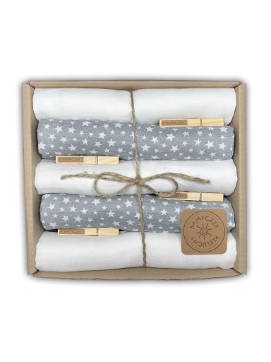 Komplet 5 sztuk najwyższej jakości pieluszek jest efektownie opakowany, gotowy do wręczenia jako prezent. W zestawie znajduje się również gratis w postaci firmowych klamerek.