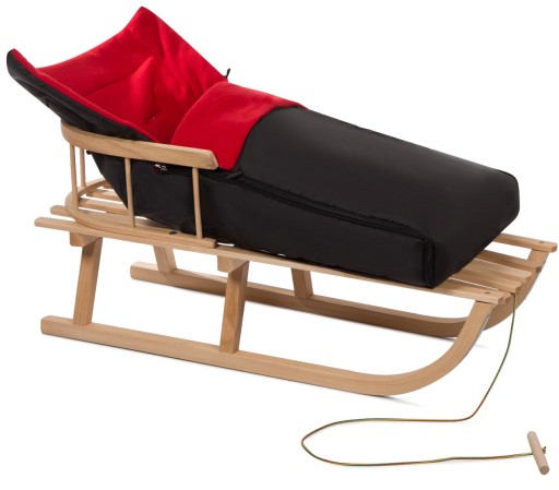 Tradycyjne Sanki drewniane z oparciem i śpiworkiem.