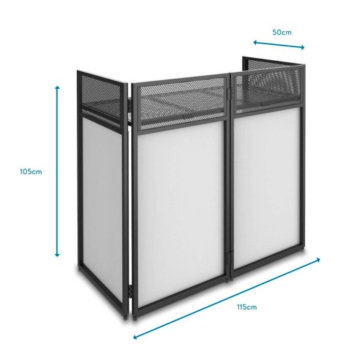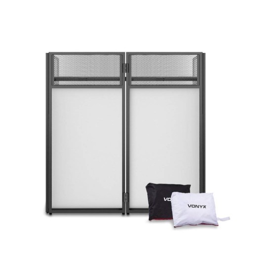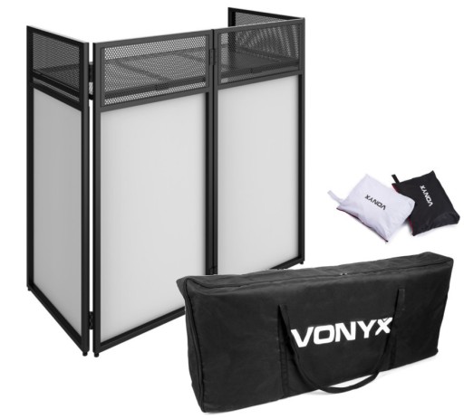 Vonyx DB4 to składana budka DJ-a, która jest dostarczana z białymi i czarnymi materiałami z lycry oraz poręczną torbą do ochrony i transportu. Stoisko DJ-a jest szybkie i łatwe w konfiguracji, a stanowisko DJ-a może być stylowo ubrane dzięki biało-czarnym ubraniom. Szczególnie na białym ekranie stanowisko DJ-a może uzyskać wyjątkowy wygląd, umieszczając w nim efekt świetlny. Inną opcją wyróżnienia kabiny jest połączenie czarno-białych tkanin, nadając budce zabawny wygląd.