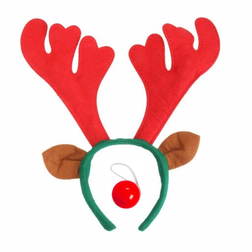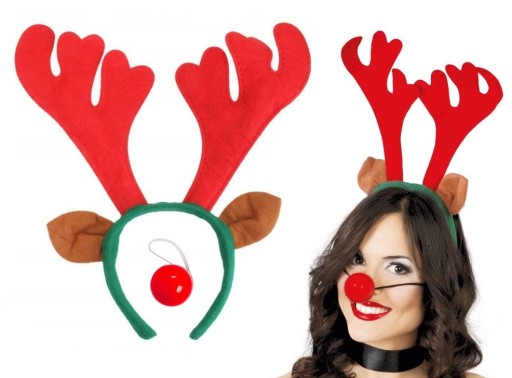 Czerwone rogi, zielona opaska, ozdobiona brązowymi uszkami renifera.