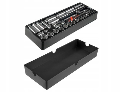 Wkład zawiera zestaw nasadek 3/8" 25 elementów. Nasadki zostały wykonane ze stali chromowo- wadanowej, dzięki czemu są bardzo wytrzymałe.