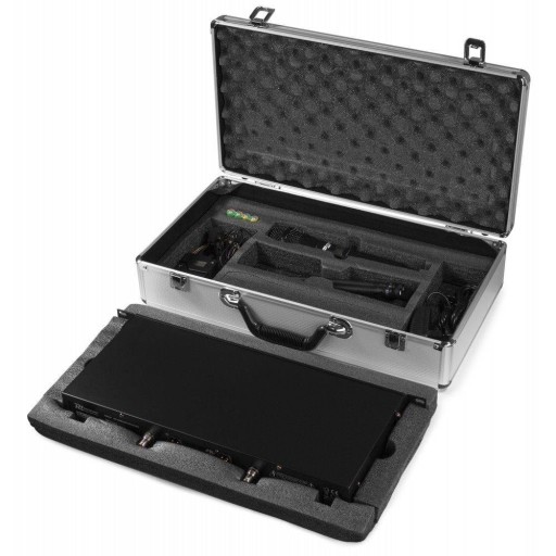 Zestaw pracuje w pasmach UHF w zakresie od 863.000 MHz do 865.000MHz i zawiera 20 kanałów, a zasięg pomiędzy odbiornikiem i nadajnikiem wynosi nawet do 45 metrów. Dodatkowo dwie długie anteny podłączane na tylnym panelu odbiornika oddzielnie dla kanału A i B sprawiają pewniejsze połączenie radiowe. Odbiornik nie generuje dużych poziomów szumów i według danych jakie podaje producent są one poniżej 97dB. Całość można zainstalować w racku 19" i mieści się on w rozmiarze 1U (czyli standard). Warto również wspomnieć, że na wyświetlaczu jest cały czas pokazana siła połączenia RF i AF.