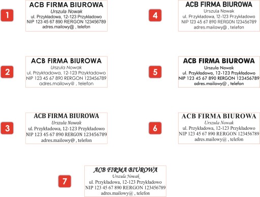 UWAGA! Treść pieczątek jest kopiowana z wiadomości do sprzedającego. Prosimy w związku z tym o dokładne sprawdzenie poprawności wysłanej treści. Po zrealizowaniu zamówienia, bądź wcześniejszej akceptacji projektu nie ponosimy odpowiedzialności za błędy w przesłanej treści.
