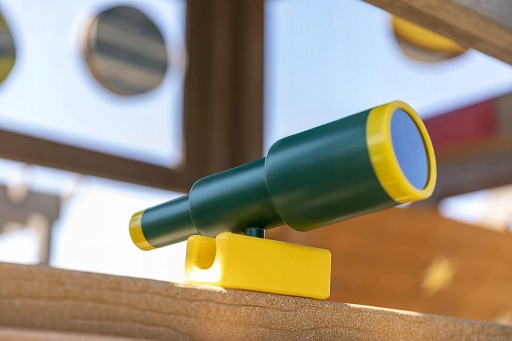 Plastikowy teleskop dostępny w dziesięciu zestawach kolorystycznych to wspaniały i bezpieczny gadżet do zabawy. Wykonany jest z trwałego tworzywa sztucznego HDPE formowanego metodą EBM (wytłaczanie z rozdmuchem), odpornego na warunki atmosferyczne oraz promieniowanie UV. Teleskop posiada bezpieczne plastikowe soczewki które nie spełniają funkcji powiększających (nie skupiają promieni słonecznych!). To bardzo dobry dodatek urozmaicający każdy plac zabaw. Idealny dla dzieci lubiących zabawę na świeżym powietrzu związaną z poznawaniem świata i przyrody. Szerokie zastosowanie w różnego rodzaju konstrukcjach lub zestawach zabawowych niewielkim kosztem zwiększy ich możliwości i funkcjonalność oraz pozwoli je dodatkowo uatrakcyjnić w oczach dziecka. Może być stosowany również oddzielnie. Teleskop posiada przykręcaną podstawę do zamocowania go do podłoża oraz przegub kulisty umożliwiający ruch we wszystkich kierunkach. Jest bardzo łatwy w montażu, a sam sposób jego zamontowania jest trwały i bezpieczny. W zestawie z wkrętami mocującym.