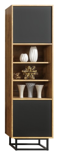 Oryginalny słupek (witryna) w stylu loftowym, której konstrukcja wykonana jest z wysokiej jakości płyty laminowanej o grubości 15 mm gwarantującej wytrzymałość. Mebel posiada dwoje drzwi oraz otwartą wnękę z półkami. Drzwiczki otwierają się przy wykorzystaniu systemu push to open. Cały mebel posadowiony został na metalowej ramie w kolorze czarnym, co zdecydowanie nadaje mu niebywałego charakteru. Oryginalny design mebla sprawia, że zachwyci on niemal każdego gościa Twojego domu.