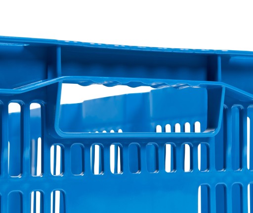 - Dodatkowe otwory boczne wraz z uchwytami umożliwiają cyrkulację powietrza wewnątrz pojemnika przy piętrowaniu skrzynek.