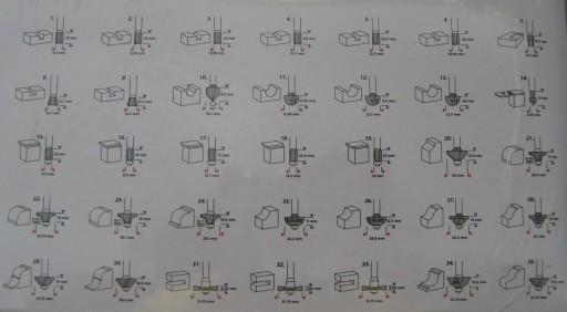 W zestawie znajdują się frezy o różnych kształtach: 13 frezów do rowków typu U, 6 frezów prostych, 3 frezy kształtowe, 3 frezy do wpustów, 10 frezów ozdobnych.