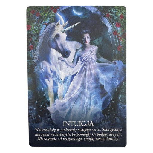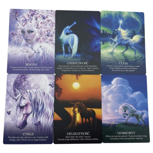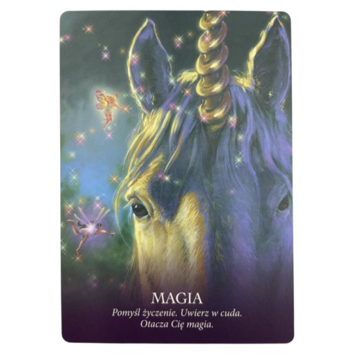 Wejdź do zaczarowanego królestwa magii i cudówJednorożce, najbardziej urokliwe z mistycznych stworzeń, są symbolem cudów, czystości i magii. Wejdź do ich cudownego królestwa dzięki Wyroczni Jednorożców i obudź na nowo intuicję, wewnętrzną mądrość i boski potencjał. Jednorożce, które widzisz na kartach tej talii, pomogą Ci Odkryć drzemiącą w Tobie magię. Pragną one, abyś stał się świadomym twórcą własnej rzeczywistości. Pomorze ci w tym nieskończona moc wszechświata, byś mógł czynić cuda. Przyjmij energię Jednorożców i doświadcz większej radości, miłości, spokoju i dostatku.