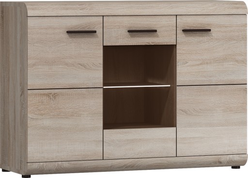 Nowoczesna komoda trzydrzwiowa z witryną, wyposażona w półki należąca do systemu LARGO. Komoda nie posiada oświetlenia LED w zestawie. Możliwość kupna mebla z oświetleniem na osobnej aukcji. Subtelna kolorystyka i ciekawe wzornictwo to cechy charakterystyczne. Elementy z kolekcji LARGO pozwolą w bardzo ciekawy i praktyczny sposób zaaranżować salon, jadalnię czy pokój młodzieżowy. Meble wykonane z wysokiej jakości płyty, listwy z płyty MDF, korpus oklejony obrzeżem ABS. Meble pakowane w paczki, do samodzielnego montażu. Do kompletu dołączona przejrzysta instrukcja montażu. Produkt w 100% polski.