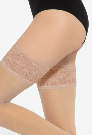 Praktyczne i delikatne, silikonowe paski stanowią gwarancję niezawodności pończoch samonośnych. Bardzo dobrze przylegają do ciała. Dzięki ich zastosowaniu materiał nie zsuwa się, ani nie marszczy. Silikonowe paski zostały zamaskowane szerokim paskiem dekoracyjnym - ze zmysłowej koronki.
