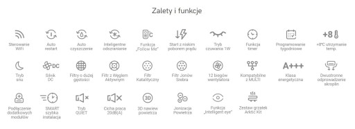 Nowoczesna konstrukcja silników wentylatora DC oraz ulepszone wygłuszenie jednostki wewnętrznej sprawiają, że praca naszego klimatyzatora jest w zasadzie nie słyszalna. Funkcja QUIET obniża głośność pracy klimatyzatora nawet do 21 dB(A) tworząc idealne warunki w sypialni, pokoju dziecka – nie zakłócając spokojnego snu Twoich bliskich.