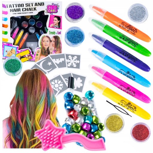 Ten zestaw umożliwia tworzenie szalonych fryzur oraz tatuaży już w kilka minut. Wszystkie zastosowane kosmetyki są bezpieczne i łatwo zmywalne wodą!