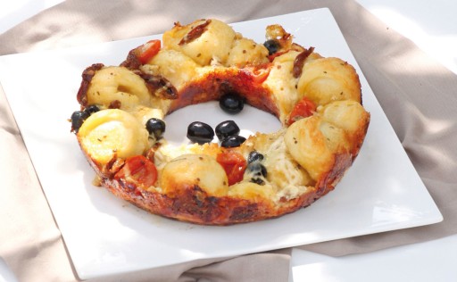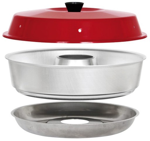 - Okrągła aluminiowa forma z otworem na środku wypełniona jest mniej więcej do połowy składnikami lub ciastem i pozwala na równomierne rozchodzenie się ciepła