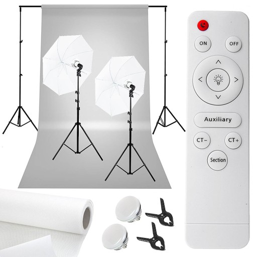 Комплект с белым фоном + 2 светодиодные лампы мощностью 100 Вт с дистанционным управлением.