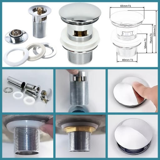 ✅ Metalowy korek umywalkowy typu klik-klak (push-open), który działa na zasadzie mechanizmu sprężynowego.
