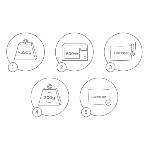 - Kiedy urządzenie przekroczy wagę całkowitą 390g, należy go umieścić w kuchence mikrofalowej na maksymalnie 6 minut przy ustawieniu mocy 600 W.