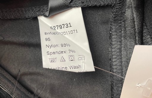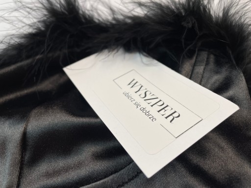 Sensualny top w kolorze klasycznej czerni. Ma modne przeszycia pod biustem. Góra topu została przyozdobiona piórkami, które zapewniają mu efekt wow. Top jest wykonany z błyszczącego materiału, który świetnie odbija światło. Tył topu jest całkowicie gładki. Biustonosz jest wkładany przez głowę, nie posiada zapięcia. Został wykonany z elastycznego materiału, który ułatwia jego zakładanie oraz zapewnia wygodę noszenia. Skład topu to 93% nylon oraz 7% spandex. Według naszej opinii świetnie się prezentuje. Posiada delikatne ślady użytkowania.