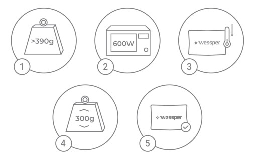 - Kiedy urządzenie przekroczy wagę całkowitą 390g, należy go umieścić w kuchence mikrofalowej na maksymalnie 6 minut przy ustawieniu mocy 600 W.