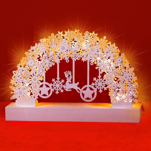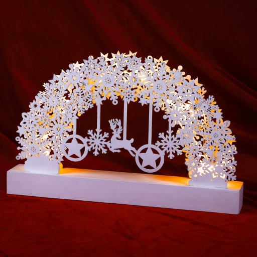 Dzięki ukrytej pod postumentem komorze na baterie masz wolny wybór, gdzie postawisz łuk. Ciepłobiałe diody LED zapewniają świąteczną atmosferę.