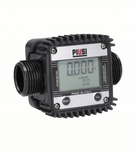 Piusi K24 to uniwersalny przepływomierz do stosowania z cieczami o małej lepkości. Dedykowany jest do oleju napędowego, AdBlue, benzyny. Ten przepływowy licznik elektroniczny w prosty sposób zamontujesz pomiędzy wężem wydającym a pistoletem, po prostu przykręcając go w odpowiednik kierunku. Wyświetlacz w liczniku K24 jest obrotowy, tzn. możesz przy pomocy śrubokręta wykręcić mocujące go śruby i obrócić w dowolną stronę a następnie przykręcić go. Zasilany jest bateriami AAA 1,5V (w zestawie).