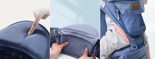 Wykorzystując technologię granulatu silikonowego, nasze nosidełko ma siedzisko dla Twojego malucha, które nie przesuwa się do przodu. Posiada poduszkę z gąbki o grubości 1.5 cm, która zmniejsza nacisk na brzuch.