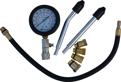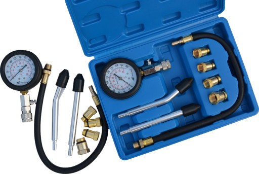 Tester do kontroli ciśnienia sprężania w cylindrach silników benzynowych z wyposażeniem poszerzającym jego możliwości. W walizce plastikowej znajduje się manometr z zaworem, przedłużka prosta i zagięta, przedłużający wąż ciśnieniowy oraz 4 adaptery do podłączenia do cylindrów. Części są wyposażone w szybkozłącza do łatwego i szybkiego zamontowania.