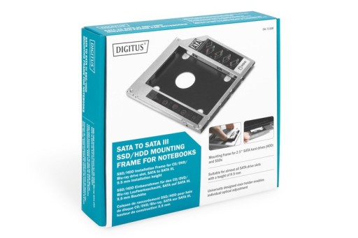 Ramka montażowa SSD/HDD do napędu CD/DVD/Blu-ray, SATA na SATA III, 9,5mmRama montażowa SSD/HDD dla portu napędu CD/DVD/Blu-ray to idealne rozwiązanie dla wyposażenia notebooka. Rama ta zastępuje napęd optyczny (CD/DVD/Blu-ray) dyskiem twardym. Jeśli ramę wyposażymy w oryginalną osłonę napędu, to taka wymiana pozostanie z zewnątrz niewidoczna. Rama montażowa odpowiada wysokości portu 9,5 mm i jest przeznaczona do ram SATA SSD i HDD 2,5”. Ramę montażową SSD/HDD dla portu napędu CD/DVD/Blu-ray można wykorzystywać w przypadku niemal wszystkich optycznych portów napędu z przyłączem SATA. Stanowi ona rozszerzenie pamięci dzięki zastosowaniu dysku twardego/SSD i umożliwia szybki dostęp do znajdujących się tam danych.