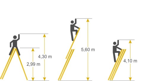Ponadto masz możliwość rozłożenia drabiny na schodach i pochyłościach terenu. Przy stosunkowo niewielkich wymiarach transportowych (3,15 m) sięgniesz z niej do wysokości ok. 7,69 m.
