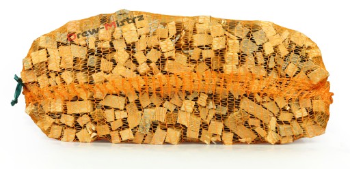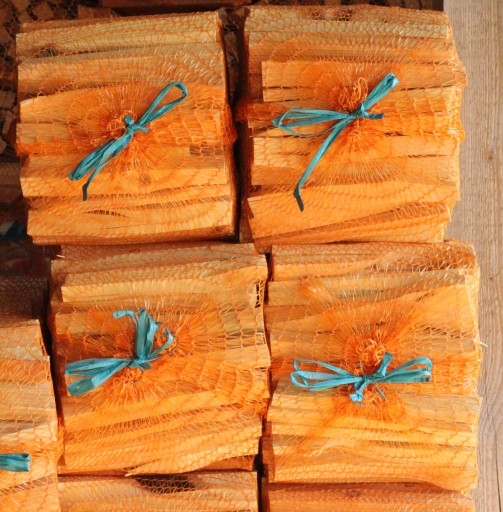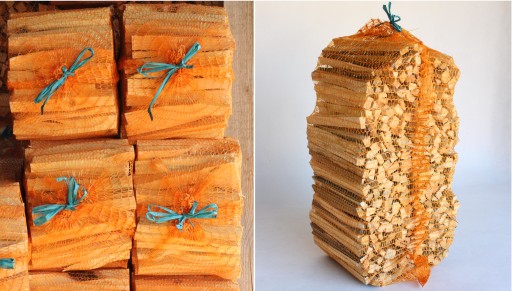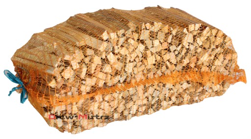 Rozpałka sosnowa o wilgotności 8-14 % pakowana w worki raszlowe o wymiarach 40 cm x 60 cm.