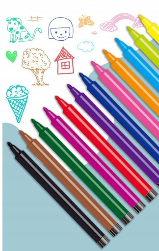 - W zestawie znajdują się 3 dyski z 8 wzorami obrazków czyli razem 24 wzory, 12 mazaków w najpotrzebniejszych kolorach ,gąbka do zmazywania obrazków oraz dodatkowy blok papierowy do malowania.