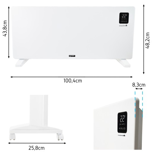 | Moc 2500W | 2w1 grzejnik konwektorowo-panelowy | Termostat elektroniczny | Zakres temperatur 5 - 50°C | Timer 24h/7d | Tryb ECO | 2 poziomy mocy | 24h - programator czasowy | Wi-Fi | 3 sposoby montażu | Certyfikat CE |