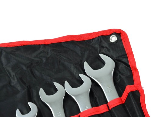 ✔️ Zestaw kluczy płasko-oczkowych 6-22 mm zapakowany jest w wygodne zwijane etui dzięki czemu zajmuje mało miejsca. Otwory w górnych rogach etui umożliwiają powieszenie kluczy na ścianie. Pokrowiec wykonany jest z bardzo mocnego i wytrzymałego materiału. W zestawie znajdują się najbardziej popularne rozmiary kluczy.